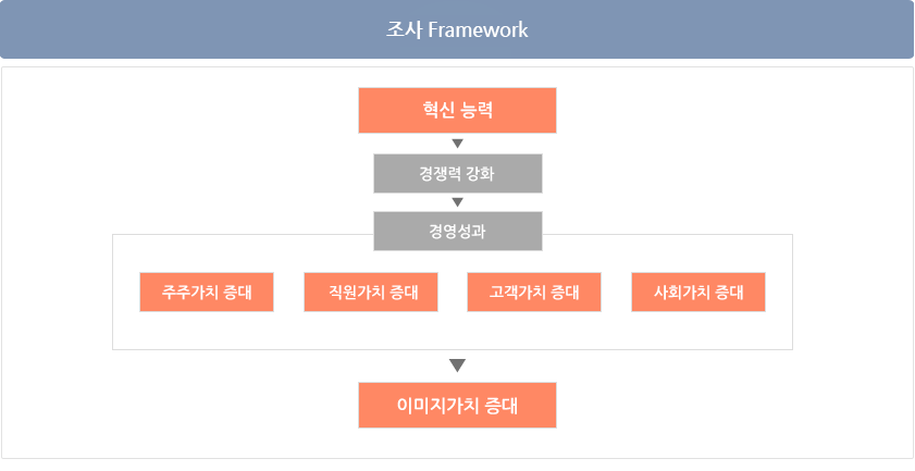 ‘한국에서 가장 존경받는 기업’은 끊임없는 혁신 활동을 통해 다져온 우수한 경쟁력을 바탕으로 주주가치, 직원가치, 고객가치, 사회가치, 이미지가치를 증대시킴으로써 모든 이해관계자에게 존경을 받고 있는 기업을 말합니다. 즉, 경영환경 변화에 유연하게 대응하고, 경영환경을 선도할 수 있는 혁신 능력을 토대로 타사와 차별되는 핵심 성공요인으로서 탁월한 경영성과를 거둘 수 있는 원동력확보를 통해 재무성과뿐만 아니라 고객과 직원의 가치를 포함한 총체적인 기업가치를 향상시키고 이는 결국 기업의 이미지가치 제고로 이어진다는 것을 의미합니다.
