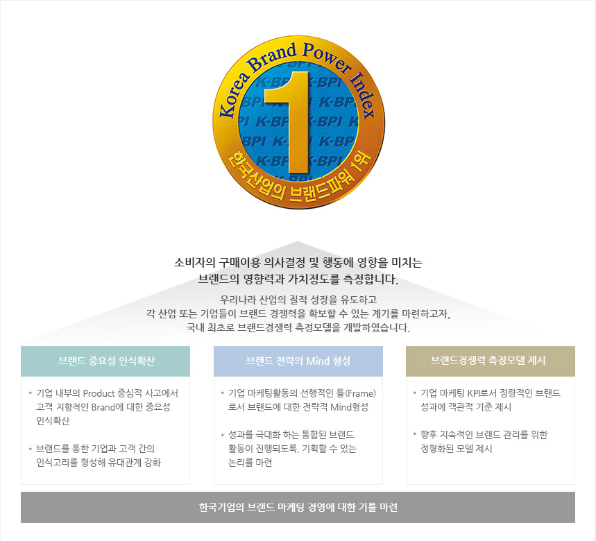 「K-BPI (Korea Brand Power Index : 한국산업의 브랜드파워)」 조사는 브랜드 인지도와 충성도로 구성된 브랜드파워 조사 결과를 매년 우리 산업계에 공표함을 기본 운영방침으로 하고 있으며, 이를 통해 각 산업군 및 기업의 현 위치를 확인하고 브랜드파워 향상을 위한 방향을 제시함으로써 기업의 경쟁력 강화와 전략적 브랜드 관리를 위한 기초 자료로 활용될 수 있도록 하는 데에 그 목적이 있습니다.