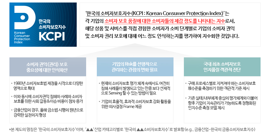 · 한국의 소비자보호지수(KCPI)는 소비자 보호의 필요성에 대한 사회의 목소리가 커지고 있는 환경에서 소비자 권익의 선행관리를 통해