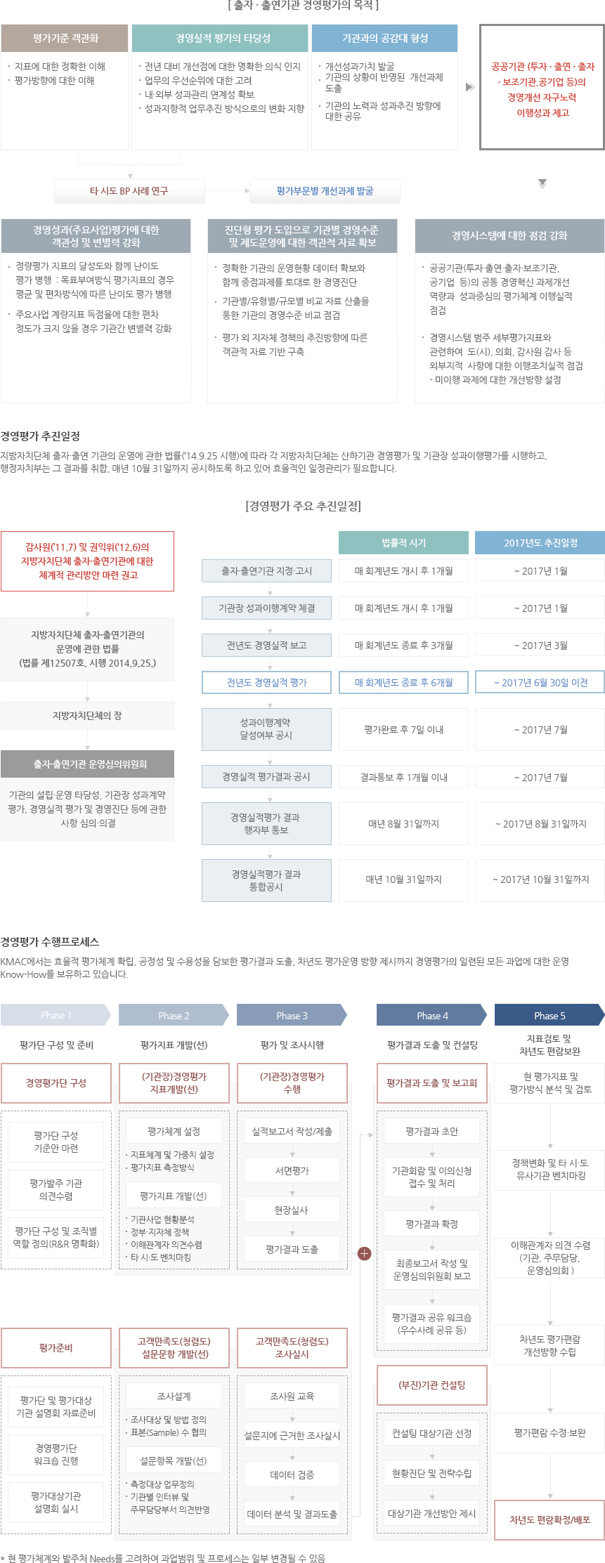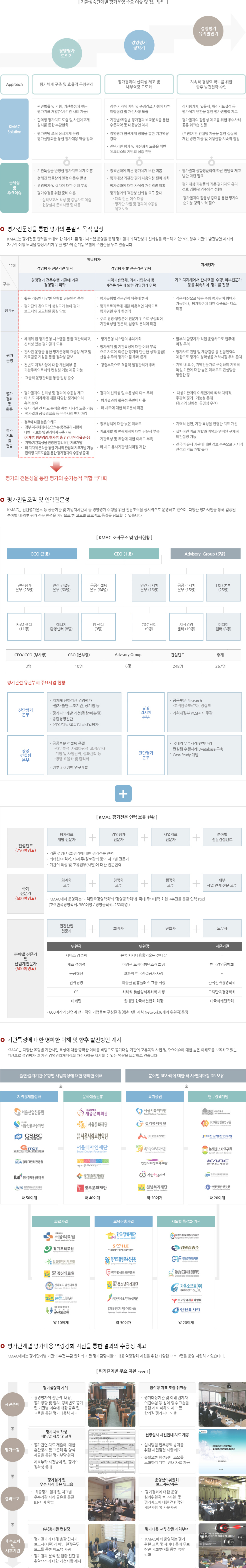 KMAC는 국내 최대 경영평가 수행경험을 통해 각 지방자치단체의 정책 및 특성, 기관의 수준별 역량을 고려한 평가제도 운영 방안에 대한 Know-How 및 기관의 지속적 경쟁력 확보를 위한 중장기적 발전전략을 제시할 수 있는 역량을 보유한 평가전문 기관입니다.