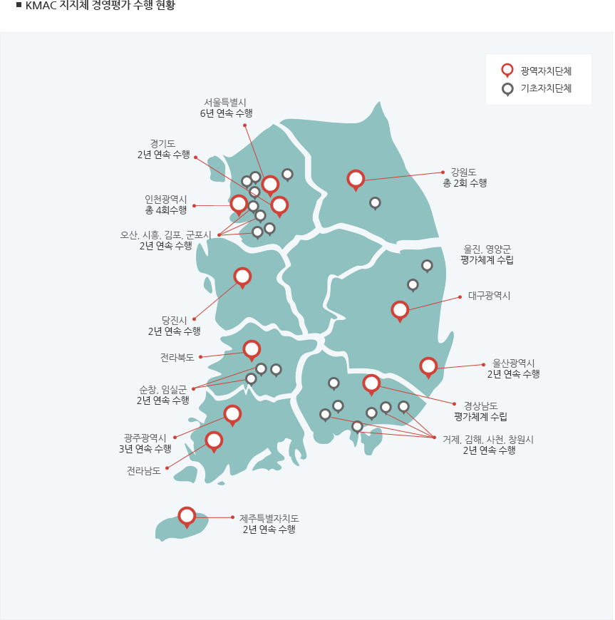 KMAC는 서울시 및 경기도를 비롯한 전국 대부분의 광역시도 및 기초단체(시·군·구)에 대한 출자출연기관 경영평가의 주간사업자로서 다년간 선정되어 이와 관련한 평가의 전문성 및 Know-how, KMAC만의 독자적인 DB를 보유하고 있는 국내 유일의 기관입니다.