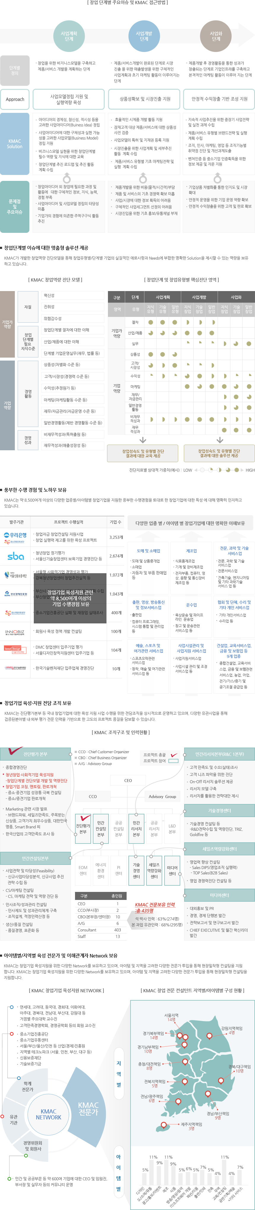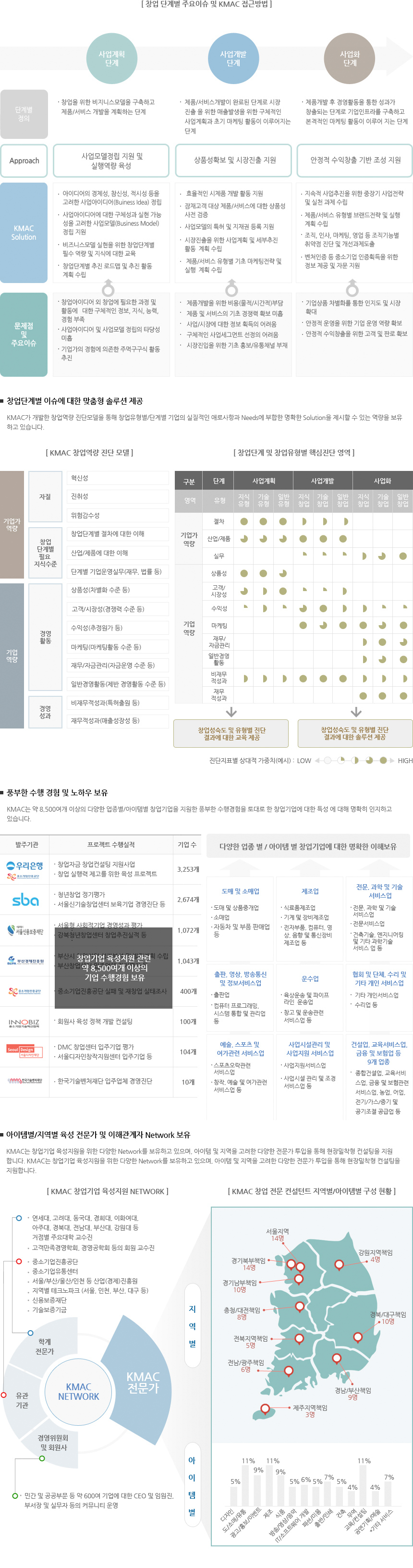 KMAC는 다년간의 다양한 창업관련 사업수행경험을 바탕으로 사업계획 부터 사업화 단계까지 창업기업이 직면하게 되는 문제점과 이슈에 대한 명확한 이해와 솔루션을 보유하고 있는 기관입니다.