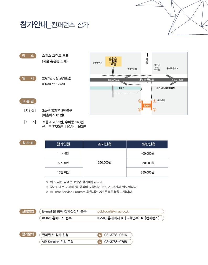 | 교육담당자 | 이혜수 / 02-3786-0184 / hyesueyi@kmac.co.kr 이현승 / 02-3786-0785 / publiconf@kmac.co.kr |