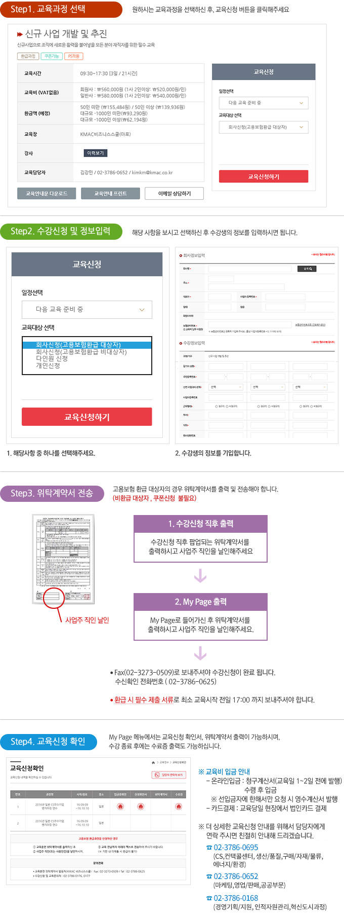 이때 고용보험환급대상자께서는 교육훈련 위탁계약서를 저희 KMAC로 보내주셔야 수강신청이 완료됨을 유의하시기 바랍니다.