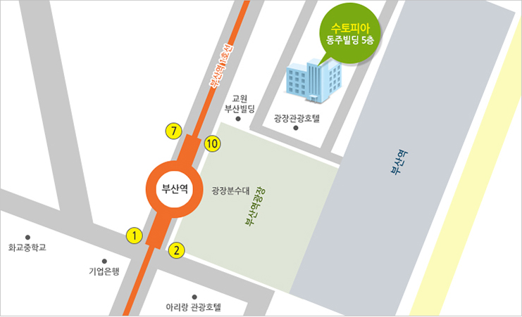 부산 지하철 1호선 부산역 10번 출구 (부산역에서 약 100mm, 도보 3분)
