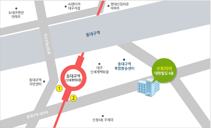 대구 지하철 1호선 동대구역(신세계백화점) 2번 출구 (동대구역에서 400mm, 도보7분)